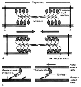 За счет освобождающейся энергии происходит связывание головок с нитью актина, изгибание «ножки» и вследствие этого актиновые филаменты продольно перемещаются относительно центрального миозинового стержня. Уменьшение же концентрации Са2+ до прежнего минимального уровня вызывает размыкание поперечных мостиков и возвращение