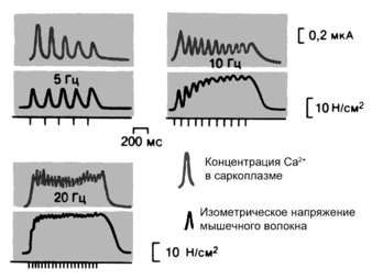 При достаточно высокой частоте стимуляции выходящий из ретикулума Са2+ не успевает вернуться в цистерны, а мышца поэтому будет постоянно находиться в состоянии максимальной активации. Возникающий при этом вид сокращения называется гладким тетанусом. Существенно, что повышение частоты стимуляции сопровождается увеличением силы, развиваемой мышцей. При гладком тетанусе напряжение, развиваемое мышцей, обычно в 2-4 раза больше, чем при одиночном сокращении. В естественных условиях для скелетных мышц характерны режимы тетанических, а не одиночных сокращений.