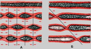 Рис. 48. Моторная активность кишки. А - маятникообразные движения (ритмическая сегментация); Б - перистальтические движения.