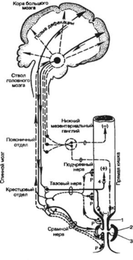 Рис. 49. Рефлекторное обеспечение дефекации. Р — рецепторы; 1 — внутренний сфинктер заднего прохода; 2 — наружный сфинктер заднего прохода; 3 — анальные железы; 4 — интрамуральные парасимпатические ганглии; (+) —влияния, повышающие тонус мышцы; (—) — влияния, понижающие тонус мышцы.