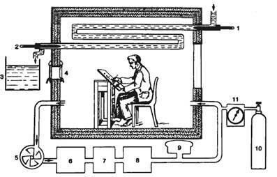Одновременно в биокалориметр подается О2 и поглощается избыток СО2 и водяных паров. Схема биокалориметра приведена на рис. 52. Продуцируемое организмом человека тепло измеряют с помощью термометров (1,2) по нагреванию воды, протекающей по трубкам в камере. Количество протекающей воды измеряют в баке (3). Через окно (4) подают пищу и удаляют экскременты. С помощью насоса (5) воздух извлекают из камеры и прогоняют через баки с серной кислотой (6 и 8) — для поглощения воды и с натронной известью (7) — для поглощения СО2. О2 подают в камеру из баллона (10) через газовые часы (11). Давление воздуха в камере поддерживают на постоянном уровне с помощью сосуда с резиновой мембраной (9).