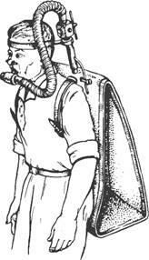 Наиболее распространен способ Дугласа — Холдейна, при котором в течение 10—15 мин собирают выдыхаемый воздух в мешок из воздухонепроницаемой ткани (мешок Дугласа), укрепляемый на спине обследуемого (рис. 53). Он дышит через загубник, взятый в рот, или резиновую маску, надетую на лицо. В загубнике и маске имеются клапаны, устроенные так, что обследуемый свободно вдыхает атмосферный воздух, а выдыхает воздух в мешок Дугласа. Когда мешок наполнен, измеряют объем выдохнутого воздуха, в котором определяют количество О2 и СО2.