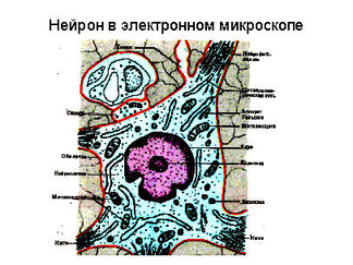 Рис. 10. Строение нейрона и электронно-микроскопическая картина строения тела клетки