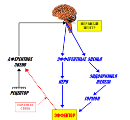 Ученик Павлова П.К. Анохин, создав концепцию о функциональной системе, как основном принципе саморегуляции функций, дополнил схему рефлекторной дуги представлением об обратной афферентации из рабочего органа в центр, которая несет информацию о состоянии рабочего органа, о ходе выполнения команды и о результатах деятельности. Представление о рефлекторной реакции как о целесообразном ответе организма диктует необходимость дополнить рефлекторную дугу еще одним звеном — петлей обратной связи, призванной установить связь между реализованным результатом рефлекторной реакции и нервным центром, выдающим исполнительные команды. Обратная связь трансформирует открытую рефлекторную дугу в закрытую. Она может быть реализована разными способами: от исполнительной структуры к нервному центру (промежуточному или эфферентному двигательному нейрону), например, через возвратную аксонную коллатераль пирамидного нейрона коры больших полушарий или двигательной моторной клетки переднего рога спинного мозга. Обратная связь может обеспечиваться и нервными волокнами, поступающими к рецепторным структурам и управляющими чувствительностью рецепторных афферентных структур анализатора.