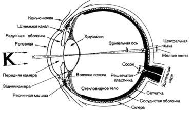 Зрительный анализатор включает в себя - периферическую часть (глазное яблоко), проводящий отдел (зрительные нервы, подкорковые зрительные центры) и корковую часть анализатора. Орган зрения - глаз - включает в себя рецепторный аппарат (сетчатку) и оптическую систему, которая фокусирует световые лучи и обеспечивает четкость изображения предметов в сетчатке в уменьшенном и обратном виде.