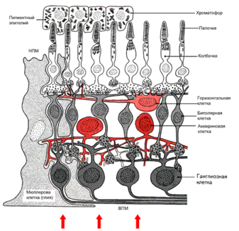 Рис. 58. Схема строения сетчатки человека ( по данным электронной микроскопии). НПМ - наружная пограничная мембрана, ВПМ - внутренняя пограничная мембрана. Стрелки внизу рисунка указывают направление падающего света.