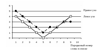 Для каждого уха отдельно подсчитывается количество воспроизведенных первых, вторых и т.д. слов и строится два графика (отдельно для слов, предъявленных в левое или правое ухо): по оси «Х» откладывается порядковый номер слова в списке, а по оси «У» - количество воспроизведенных слов с этим номером (на рис.1 показан пример такого построения).