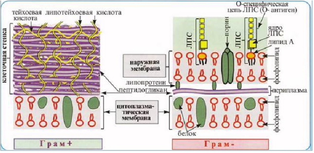 Строение клеточной стенки отличается у грамположительных и грамотрицательных микроорганизмов.