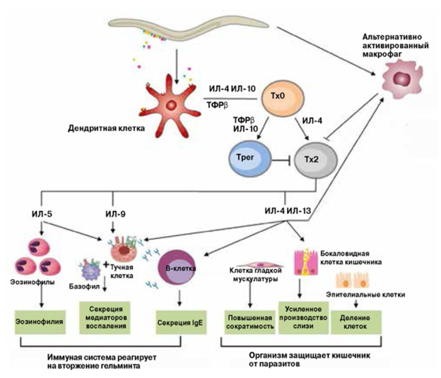 Клетки врожденного иммунитета распознают различные компоненты гельминтов (PAMP) — лизофосфатидилсерин (распознается TLR-2), липопротеины, обогащенные фосфорилхолином (распознаются TLR-4) и др.; гликаны, распознаваемые лектиновыми рецепторами, в частности DC-SIGN; протеазы, секретируемые гельминтами; хитин. В качестве распознающих клеток выступают макрофаги, дендритные клетки, энтероциты слизистой оболочки кишечника. Активация дендритных клеток приводит к развитию незрелых клеток DC2-типа, способствующих дифференцировке Т-хелперов типа Th2. Th2-ответ — преобладающая форма протективного иммунного ответа против гельминтов. Среди цитокинов, секретируемых Th2-клетками при гельмитозах, наиболее важную роль играет IL-4 (обеспечивает переключение изотипов антител на IgE), IL-13 (привлекает эозинофилы и базофилы, обеспечивает морфогенетические перестройки — ремоделирование) и IL-5 (привлекает эозинофилы). Важная защитная роль при гельминтозах принадлежит антителам класса IgE. Взаимодействуя с сенсибилизированными тучными клетками, они стимулируют выброс факторов с антигельминтной активностью и секретируют цитокины, привлекающие базофильные и эозинофильные гранулоциты. Эозинофилы и базофилы формируют вал вокруг гельминтов и выделяют молекулы и вещества, оказывающие антигельминтное действие. Наибольшую роль среди них играют белки эозинофилов — MBP (главный щелочной белок) и ECP (эозинофильный катионный белок), способные вызвать гибель гельминта. Гибель гельминтов в кишечнике сопровождается их эвакуацией из пищеварительного тракта. Гельминты, погибшие в органах, элиминируются клетками мононуклеарной фагоцитирующей системы.