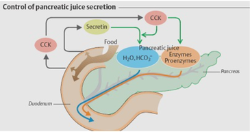 • кислый химус, поступающий из желудка, стимулирует количество секрета и HCO3- клеток протоков,