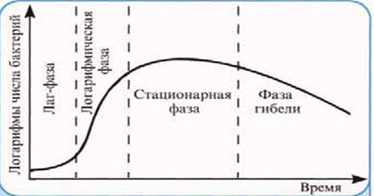1. Лаг - фаза - начальная стадия физиологической адаптации с медленным темпом роста биомассы бактерий. Зависит от возраста посевного материала и предшествовавших условий культивирования, продолжительность - 4 часа;