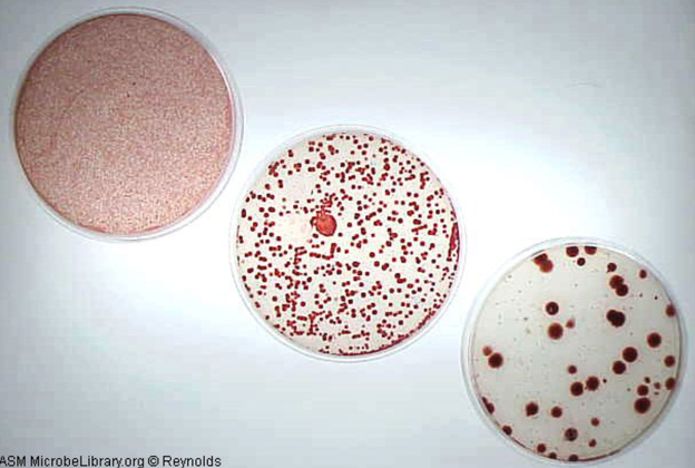 Количество колоний в чашках с питательной средой уменьшается по мере разведения материала.