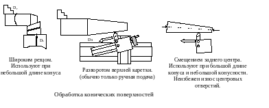 онические поверхности могут быть обработаны широким резцом, разворотом верхней каретки суппорта, смещением заднего центра, на копировальных станках и станках с ЧПУ.