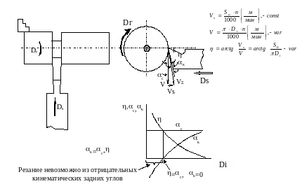 i при отрезке уменьшается, а значит, уменьшается скорость резания V, т.е. угол к будет увеличиваться. Поскольку к=-к, то по мере приближения вершины резца к оси заготовки, кинематический задний угол будет уменьшаться. При приближении вершины резца к центру заготовки к неизбежно станет равным , т.е. к станет равным нулю и процесс резания прекращается (резец отламывает отрезаемую часть).