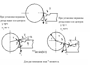 чень важна установка вершины резца на одной высоте с осью вращения заготовки (по линии центров станка). Смещение резца выше оси заготовки при наружном точении и ниже оси заготовки при растачивании может привести к тому, что главный задний угол α может принять нулевые или отрицательные значения, что приведет к сильному трению по задней поверхности и даже невозможности осуществления процесса резания