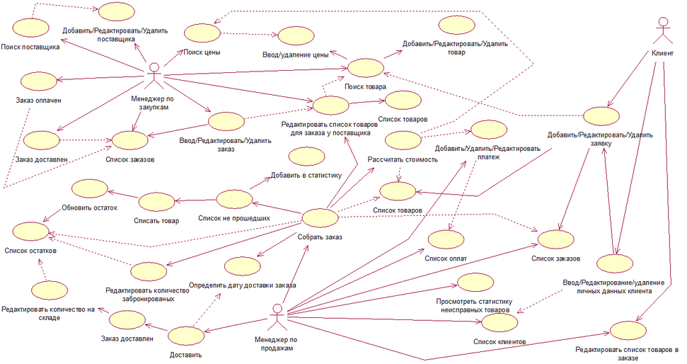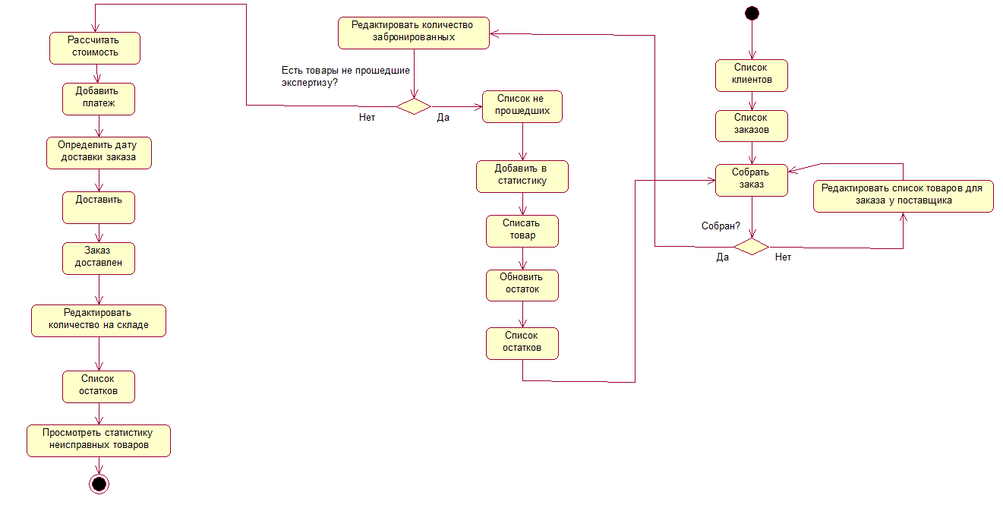 Первоначальные действия менеджера это формирование списка клиентов и списка заказов. Далее осуществляется сборка заказа, если заказ не собран, то редактируется список товаров для заказа у поставщика, иначе редактируется количество забронированных товаров и т.д.