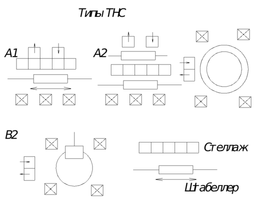 В состав ТНС входит центральный конвейер накопитель и буферные накопители у каждого станка. Конвейеры-накопители имеют приемно-передаточные устройства, которые служат для передачи тары с одних ветвей конвейера на другие. Например, с продольных на поперечные в обе стороны. Кроме того, АТНС содержит приемно-передаточные устройства станков, устройства фиксации спутников на конвейере, устройства для считывания кодов спутников и тары, камеры промывания деталей и спутников.