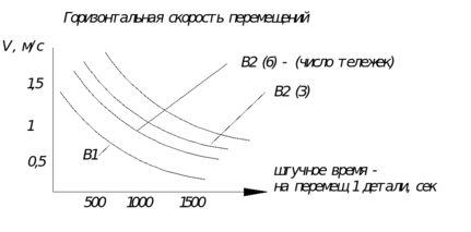 Очевидно, что с увеличением сложности ТНС растет скорость перемещения одной детали, при этом зависимость близка к тангенсальному закону распределения. Тогда как, одновременно с этим, стоимость штучной транспортировки оказывается минимальной у самого простого варианта транспортной системы. Следует всегда помнить об этом балансе между стоимостью и скоростью перемещения одной детали.