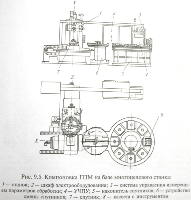 На рисунке приведена компоновка ГПМ , построенного на базе серийного горизонтального многоцелевого сверлильно-фрезерно-расточного станка с ЧПУ. ГПМ оснащен дополнительным накопителем приспособлений-спутников. Устройство смены спутников представляет собой двухпозиционный поворотный стол, связывающий станок с накопителем. На спутник можно устанавливать как заготовку, так и кассету с инструментом. Кассета в нужный момент подается на стол станка, а затем манипулятор заменяет инструмент.