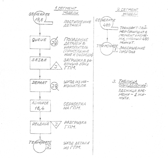 Интервалы поступления корпусных деталей на модуль распределены равномерно в интервале 18±6 минут. Время обработки также распределено равномерно в интервале 16±4 минуты. Дисциплина обслуживания “первым пришел- первым обслужен”. Модель процесса обработки на ГПМ должна обеспечить сбор статистических данных об очереди. Необходимо промоделировать работу ГПМ в течение 8часов модельного времени.