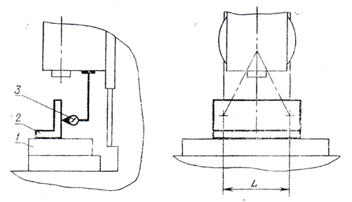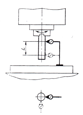 Проверяется у торца шпинделя и на расстоянии L. В шпиндель устанавливают контрольную оправку. Измерение биения происходит в 2х плоскостях.