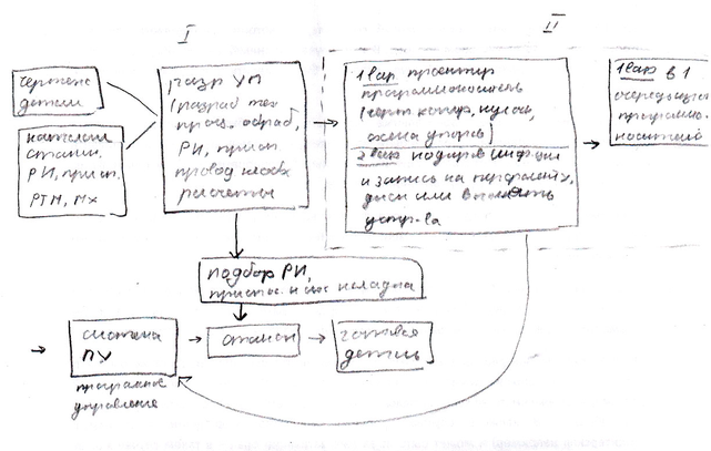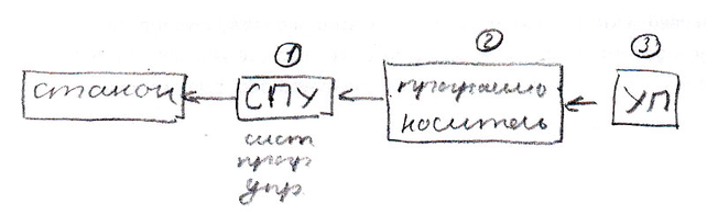 Программоноситель сначала надо спроектировать (копир, кулачок и циклограмма, цикловые – упоры). ЧПУ – закодировать и записать на программоноситель. Программоносители сложно изготавливать (материал – закаленная сталь), иначе они быстро изнашиваются. Поэтому предпочтение отдается ЧПУ, а этап изготовления программоносителя надо ликвидировать (то, что в рамочке)