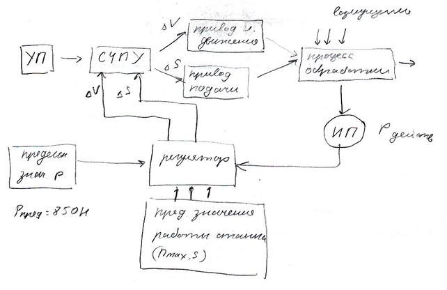 Устанавливаем предельное значение P. Измеряем действительное P. Устанавливаем регулятор, который проводит сравнение сил резания. Засчет регулирования силы резания и подачи добиваемся нужной силы резания.
