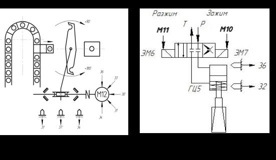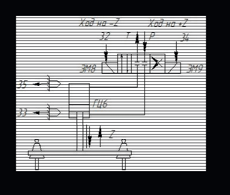 Сигнал М06 поступает на электромагнит 4 золотника и подключает гидроцилиндр 4 к гидросистеме станка. Гидросистема обслуживает весь станок (т.к. М06 поступает на электромагнит) В верхней полости гидроцилиндра создается давление и движение поршня осуществляет выдвижение ячейки инструментального магазина до фиксированного положения специального ИП, который выдаст сигнал 30. Сигнал 30 включает двигатель М12 привода вращения руки автооператора. После поворота руки на -90 формируется сигнал 31. Произойдет остановка привода вращения автооператора. По сигналу М11, поступающему на ЭМ67 происходит разжим инструмента в шпинделе. По сигналу 32, поступающий на электромагнит 7 происходит включение золотника. Под давлением масла, которое приходит в верхнюю полость гидроцилиндра осуществляется ход автооператора вдоль оси z на -180 мм. Движение выполняется до фиксированного положения ИП, вырабатывающего сигнал 33. Сигнал 33 включает двигатель М12, который поворачивает руку автооператора на -180 градусов до положения ИП, выдающего сигнал 34 и автооператор останавливается. По сигналу 34, поступающему на электромагнит 9 происходит включение золотника гидроцилиндра ГЦ6. Под давлением масла, которое приходит в нижнюю полость гидроцилиндра осуществляется ход автооператора на z + 80 мм. Как только автооператор достигнет определенного положения, вырабатывается сигнал 35. По сигналу М10, приходящему на электромагнит 7 золотника гидроцилиндра 5 масло подается в его нижнюю полость, шток которого зажимает оправку с инструментом в шпинделе. После зажима инструмента формируется сигнал 36, который включает двигатель М12, который приводит в движение автооператор. После поворота руки автооператора на +90 формируется сигнал 37, который останавливает привод автооператора и снимает сигнал М06 с электромагнита 4. После снятия с электромагнита сигнала М06 происходит переключение золотника и ячейка инструментального магазина задвигается. При этом формируется сигнал 38, завершающий цикл смены инструмента.