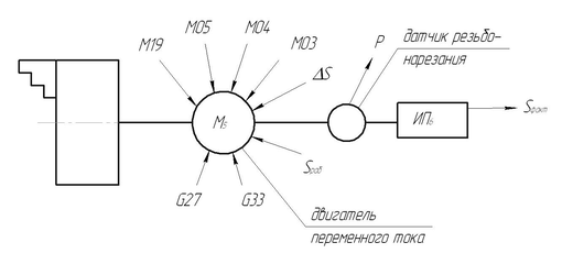 Эта функция предусматривает включение/отключение привода, выбор направления вращения и диапазона частот вращения, стабилизацию частоты вращения (обратная связь по скорости), аварийный останов привода. В некоторых случаях требуется программное изменение угла поворота (например, при нарезании резьбы), ориентированный поворот шпинделя (при смене инструмента), смена режима работы (при работе многоцелевого токарно-фрезерного станка). Часть управляющих сигналов формируется в соответствии с определенными значениями вспомогательных функций в управляющей программе. Например: