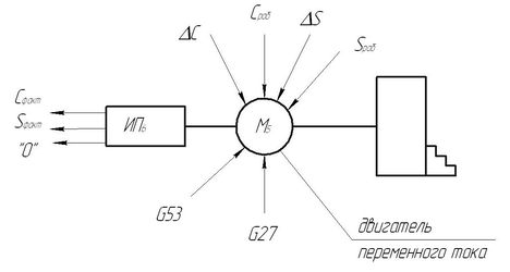 Частота вращения может быть задана в управляющей программе косвенным способом или способом прямого обозначения. В первом случае каждому значению функции S соответствует в выбранном диапазоне определенная частота. Например, S54 – частота вращения 493 об/мин. В этом случае дешифратор кодов функций S может находиться в шкафу автоматики станка. Во втором случае частота сразу задается по адресу S. Для стабилизации частоты обычно используют замкнутую систему регулирования с ИП обратной связи в виде тахогенератора. Заданное значение формируется цифро-аналоговым преобразователем ЦАП. На вход этого ЦАП поступает вход функции S, соответствующий максимальному напряжению на ЦАП. Функция смены режима обработки связана с особенностью работы шпинделя токарно-фрезерного станка. Вал шпинделя может вращаться в двух режимах: вращение при точении и угловой поворот при фрезеровании. Для переключения привода с одного режима на другой требуется на двигатель привода главного движения подать сигнал соответствующей функцией G27.
