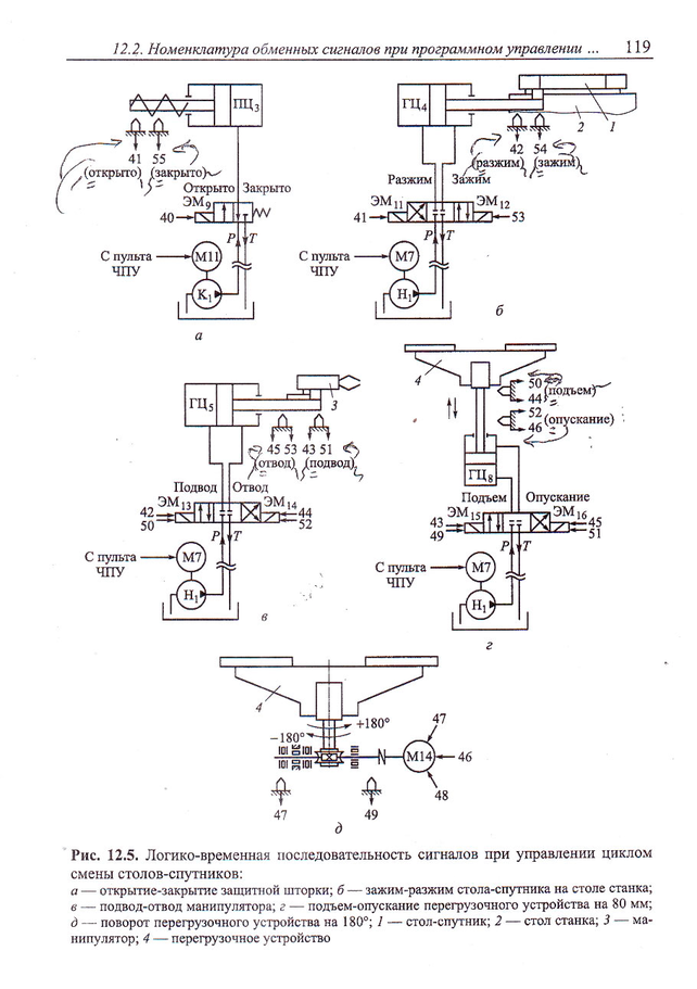 При достижении точки М60 выдается сигнал 48 (управление приводом), сигнал 48 запускает двигатель М14 привода движения перегрузочного устройства (Д). Перегрузочное устройство поворачивается на +180 градусов до срабатывания концевого выключателя, формирующего осведомительный сигнал 49, останавливающий привод вращения. По сигналу 49, поступающему на электромагнит 15 происходит включение золотника гидроцилиндра ГЦ8 (рисунок г). Под давлением масла в нижней полости гидроцилиндра 8 осуществляется подъем перегрузочного устройства. Как только оно достигнет нужного положения, вырабатывается сигнал 50. Сигнал 50 является входным для ЭМ13 золотника ГЦ5 (рисунок в). Увеличение давления масла в левой полости гидроцилиндра 5 заставляет манипулятор перемещаться в направлении стола станка. Перемещение продолжается до момента срабатывания концевого выключателя, выдающего осведомительный сигнал 51. Сигнал 50 подается в левую полость на электромагнит 15. Осведомительный сигнал поступает на электромагнит 16 золотника ГЦ8 (рисунок б). Под давлением масла в верхней полости ГЦ8 осуществляется опускание перегрузочного устройства до срабатывания концевого выключателя, формирующего осведомительный сигнал 52. По сигналу 52, приходящему на электромагнит 14 золотника ГЦ5. Масло подается в правую полость ГЦ5, шток которого вместе с манипулятором перемещается к перегрузочному устройству. Перемещение происходит до момента срабатывания концевика, который выдает сигнал 53. Сигнал 53 поступит на электромагнит 12 ГЦ4, вызывая перемещение штока вправо, что позволяет осуществлять зажим стола-спутника в рабочей зоне стола станка (рисунок б). По достижении положения фиксации стола-спутника вырабатывается осведомительный сигнал 54. По сигналу 54 происходит снятие сигнала 40 с электромагнита 9 (рисунок а). Шток пневмоцилиндра ПЦ3 перемещается вправо и происходит закрытие защитной шторки (рисунок а). После закрытия концевой выключатель выдает осведомительный сигнал 55 (шторка закрыта). Цикл завершается.