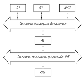Для улучшения нагрузочной способности используют вариант однопроцессорной структуры с двумя магистралями, сопряженния между которыми осуществляется через адаптер связи. В этой структуре контроллеры внешних устройств дисплея и клавиатуры оператора обычно сопрягаются с системной магистралью вычислителя. А контроллеры электроприводом, устройства работы электроавтоматики сопрягаются с системной магистралью устройства ЧПУ. Использование такой структуры более эффективно, потому что контроллеры внешних устройств станка для связи с несколькими однотипными внешними устройствами обычно выполняют на одной плате, что является по отношению к системной магистрали одной единицей нагрузки.