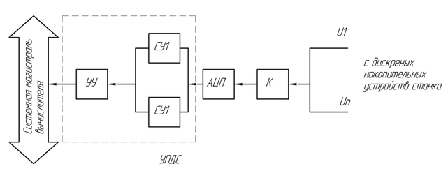 ИП дискретных сигналов подразделяются на две группы: ИП разового и постоянного контроля. К ИП разового контроля относят, например, ИП положения автооператора, который функционирует только при смене инструмента. А ИП постоянного контроля это ИП аварийного состояния механизма. Сопряжения этих устройств с УЧПУ выполняются через устройство вывода и приёма дискретных сигналов (УВДС и УПДС), через многоканальный цифроаналоговый преобразователь ЦАП, аналогово-цифровой преобразователь АЦП и коммутирующее устройство К. Структурная схема выдачи сигналов содержит аналоговое запоминающее устройство АЗУ по числу выходов дискретных сигналов.