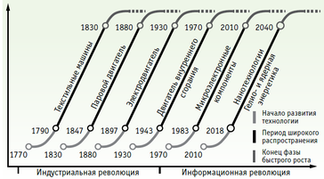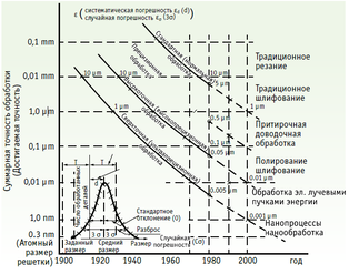 В отличие от схемы N. Taniguchi, где было упомянуто три вида обработки − традиционная, прецизионная, ультраприцизионная – на рис. 4 появилась дополнительная кривая между традиционной и прецизионной обработкой, что, по всей видимости, обусловлено необходимостью проиллюстрировать более строгое соблюдение пропорций расположения кривых с кратностью 10 (5 – 0,5 – 0,05 – 0,005 мкм). Это привело к дифференциации наименований и к появлению дополнительного вида высокопрецизионной обработки. В этом усматривается определенный смысл, так как все виды механической обработки лежат выше кривой высокопрецизионной обработки после 1980 года с потенциально достигаемой точностью не более 0,01 мкм (10 нм).