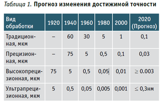 Исторический процесс повышения точности происходил быстро. К 1776 году, согласно письму Уатта, можно было получить точность расточки цилиндра длиной 72 дюйма в толщину шестипенсовой монетки (т.е. 2 мм). По данным Дж. Уилкинсона (1775 г.), расточка цилиндра диаметром 57 дюйма производилась с такой же достижимой точностью 2 мм. Темп роста достижимой точности изготовления особенно высок в наше время. Он возрастал в 10 раз за каждые 20 лет. В научной литературе, приводятся схемы изменения достижимой точности обработки с 1900 по 1980 год с прогнозными значениями до 2000−2020 годов (табл. 1).