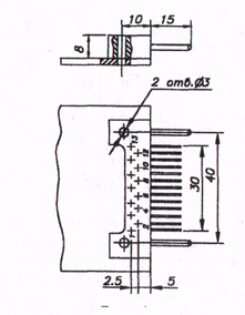 При выполнении заданий рекомендуется использовать соединитель РМ-В-вилка, устанавливаемый на плате. Его внутренние выводы располагаются в отверстиях платы под корпусом соединителя. Шаг равен 2,5 мм (рис. 4).