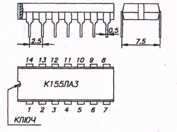 Микросхемы серии 155: ЛА1, ЛА2, ЛАЗ, ЛА4, ЛИ1, ЛЛ1, ЛЕ1, ЛЕ4, ЛН2, ЛП5, ЛР1, ЛР4, ТМ2, ТВ1 выполняют в четырнадцати-выводном корпусе 201.14. Выводы ИС нумеруют относительно ключа - выемки в корпусе; на виде сверху - против часовой стрелки. Чертеж корпуса 201.14 приведен на рис. 3.
