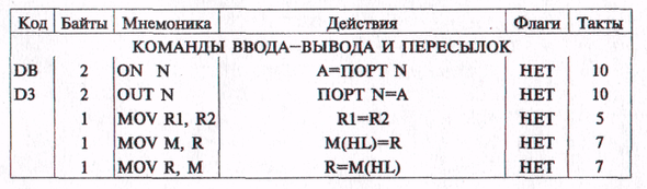 Каждая команда характеризуется: кодом команды — 1 байт (первый байт двух- или трехбайтных команд), общим количеством байт в команде, мнемоническим описанием команды, являющимся ее названием, описанием выполняемых по этой команде действий, влиянием на флаги и количеством тактов выполнения команды. При выполнении команды ее код, полученный микропроцессором по магистрали данных, устанавливается на входе первичного управляющего автомата. По тактам с частотой 2 МГц этот автомат выдает сигналы, управляющие всеми операциями в микропроцессоре. При этом выполняются действия, определенные этой командой.