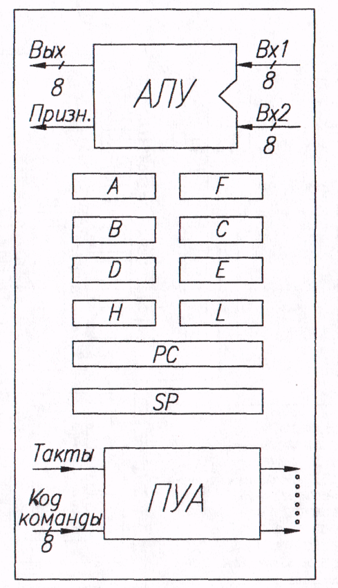 С точки зрения программирующего, микропроцессор — это набор регистров и счетчиков. Для микропроцессора КРБ80ВМ80 — это восьмиразрядные регистры A, F, В, С, D, E, H, L, a PC — программный счетчик и SP — указатель стека являются шестнадцатиразрядными счетчиками (рис. 19). Действия над их содержимым определяются командами.