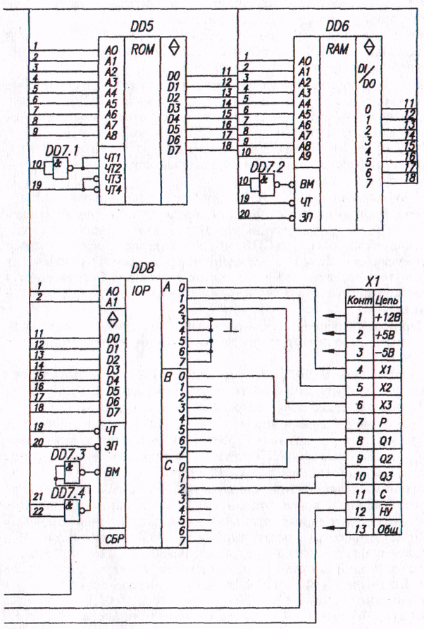 БИС ГФ24 - генератор, ВМ80 - микропроцессор, ВК38 - системный контроллер образуют процессор управляющей системы. Реальные возможности такого процессора шире требуемых для выполнения задания, поэтому есть неиспользуемые выводы этих БИС. Они на схеме не указаны.