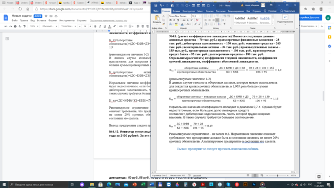 №4.8. (расчет коэффициентов ликвидности) Имеются следующие данные: денежные средства – 70 тыс. руб.; краткосрочные финансовые вложения – 28 тыс. руб.; дебиторская задолженность – 130 тыс. руб.; основные средства – 265 тыс. руб.; нематериальные активы – 34 тыс. руб.; производственные запасы – 155 тыс. руб., кредиторская задолженность – 106 тыс. руб., краткосрочные кредит банка – 95 тыс. руб.; долгосрочные кредиты – 180 тыс. руб. Определить(рассчитать) коэффициент текущей ликвидности, коэффициент срочной ликвидности, коэффициент абсолютной ликвидности.