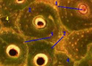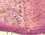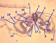 | № 1 Мазок крови человека Эритроциты отличаются характерной морфологией: лишены ядер, имеют на препарате округлую форму и относительно постоянный диаметр, в центре - более светлые, что объясняется формой клеток - в виде двояковогнутого диска. Примерно 25% объёма эритроцита занимают молекулы гемоглобина, с которыми связана основная функция эритроцитов - перенос кислорода от лёгких к тканям. С егментоядерный нейтрофил (1) (65-70 % от всех лейкоцитов). Ядро состоит из нескольких (обычно 3-4) связанных друг с другом сегментов. В цитоплазме - трудно различимая мелкая зернистость. Её образуют гранулы двух видов: специфические содержащие антибактериальные вещества, и неспецифические (производные лизосом). Нейтрофилы являются микрофагами: убивают и затем фагоцитируют микроорганизмы. Палочкоядерный нейтрофил (1) (3-5% от всех лейкоцитов). Ядро ещё не сегментировано, имеет форму изогнутой палочки. Базофильный гранулоцит (1) (0,5-1,0% от всех лейкоцитов). В цитоплазме - гранулы двух типов: мелкие неспецифические и базофильные (фиолетово-вишнёвого цвета), содержащие медиатор воспаления гистамин и противосвёртывающее в-во гепарин. Базофилы способствуют развитию воспалительных и аллергических реакций. Эозинофильный гранулоцит (1) (2-4% от всех лейкоцитов). Его ядро обычно состоит из двух сегментов. В цитоплазме вновь - гранулы 2-х видов: неспецифические, а также специфические оксифильные, окрашенные эозином в розовый цвет. Эозинофилы обладают двумя видами активности: антигистаминной (т.е. противовоспалительной и антиаллергической), а также противопаразитарной. Л имфоцит (1) (20-30% от всех лейкоцитов). Имеет небольшие размеры, крупное ядро, занимающее основную часть клетки, узкий ободок базофильной цитоплазмы. На плазмолемме лимфоцитов содержатся специфические иммуноглобулины, благодаря которым клетки участвуют в иммунных реакциях. Лимфоциты подразделяются на несколько популяций: В-клетки, Т-хелперы (резко усиливающие ответ В-клеток), Т-киллеры (убивающие чужеродные клетки). Моноцит(6-8% от всех лейкоцитов): они более, чем вдвое, крупнее окружающих эритроцитов; ядро - бобовидное, а цитоплазма имеет вид светлого широкого ободка. Моноциты в тканях превращаются в макрофаги.В качестве макрофагов они участвуют в фагоцитозе и в иммунных реакциях. | № 2 Зародыш птицы на стадии образования туловищных и амниотических складок Осевые зачатки органов, складки (туловищные (14) и амниотические (20)), образующиеся в результате сворачивания прежде плоского зародыша. Осевые зачатки а) производные эктодермы - кожная эктодерма (1) и нервная трубка (2); б) производные мезодермы -хорда (3), сомиты, которые уже разделяются на плотный дерматом (4), срединно расположенный миотом (5) и прилегающий к хорде склеротом (6), нефрогонотомы (7), спланхнотомы с висцеральным (8) и париетальным (9) листками и целомической полостью (10) между ними, мезенхима, из которой, в частности, образованы аорта (11) и клетки крови (12). энтодермы (13) начинается формирование первичной кишки. Туловищные складки образуются в результате того, что зародыш начинает сворачиваться вдоль продольной оси. Эти складки формируются всеми 4-мя листками (эктодермой, висцеральной и париетальной мезодермой, энтодермой), причём, кнаружи от складок начинается внезародышевая часть каждого листка.Здесь (снаружи от складок) листки расходятся и у