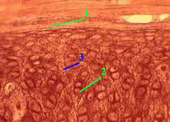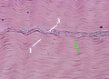 | № 4 Сухожилие Как и во всех видах соединительной ткани, здесь хорошо выражено межклеточное вещество. Но последнее в данном случае представлено, главным образом, коллагеновыми волокнами (1), которые тесно прилегают друг к другу (отчего ткань является плотной) и расположены параллельно друг другу (отчего ткань называется оформленной).Между волокнами видны фиброциты (2), обозначаемые также как тендиноциты, или сухожильные клетки: узкие, длинные, с плотным палочковидным ядром. Они окружены небольшим количеством неокрашенного аморфного компонента.Кроме того, в поле зрения - прослойка рыхлой соединительной ткани с кровеносным сосудом (3). В сухожилии коллагеновые волокна объединяются в пучки: пучки первого порядка, разделённые тендиноцитами (2), пучки второго порядка, складывающиеся из предыдущих пучков и разделённые эндотенонием (3) - тонкими прослойками рыхлой волокнистой соединительной ткани; пучки третьего порядка, окружённые более толстым слоем рыхлой волокнистой соединительной ткани. |