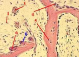 | №5. Декальцинированная трубчатая кость. Диафиз трубчатой кости образован, в основном, компактным костным веществом.В этом веществе имеются пластинки 3-х типов: общие (генеральные) - окружают всю кость, остеонные - лежат концентрическими слоями вокруг сосуда, образуя т.н. остеоны; вставочные - находятся между остеонами. Наружные генеральные пластинки (1): они лежат под надкостницей (2) и окружают всю кость. Внутренние генеральные пластинки (1). Они прилегают к эндосту (2) и вместе с ним охватывают костномозговую полость. Средний, или остеонный слой кости. В центре каждого остеона - кровеносный сосуд (1),вокруг последнего -несколько концентрических слоёв костных пластинок (2), называемых остеонными. Остеоны отграничены резорбционной (спайной) линией (3). Между остеонами лежат вставочные костные пластинки (4),которые представляют собой остатки прежних генераций остеонов. Костные пластинки включают клетки (остеоциты), коллагеновые волокна и основное вещество, богатое минеральными соединениями.При этом волокна в межклеточном веществе неразличимы, а само межклеточное вещество имеет твёрдую консистенцию. Остеоциты имеют длинные и узкие отростки.Тела остеоцитов лежат в костных лакунах (1), а многочисленные отростки - в костных канальцах (2). Центральный канал остеона, в котором проходит кровеносный сосуд (1).В этих каналах обычно содержатся также стволоые остеогенные клетки, остеобласты и остеокласты. | № 6 Развитие кости из мезенхимы. Челюсть - плоская кость и поэтому образуется путём прямого остеогенеза, т.е. непосредственно из мезенхимы. В соответствии с этим, в челюсти зародыша мы видим мезенхиму (1) и трабекулы (балки) образующейся кости (2), окрашенные в ярко-розовый цвет.В прямом остеогенезе участвуют четыре типа клеток: мезенхимные (1), остеобласты (4), остеоциты (5) и остеокласты (6). Мезенхимные клетки (1) - небольшие, вытянутой формы, со слабо базофильной цитоплазмой. На первой стадии прямого остеогенеза эти клетки, интенсивно размножаясь, формируют остеогенный островок, который к тому же прорастает сосудами. В данном случае на месте островка уже образовались костные балки, в них самих сосудов ещё нет, но возле балок видны кровеносные сосуды (3) - результат васкуляризации скелетогенного островка. Остеобласты (4) образуются из остеогенных клеток мезенхимы, расположены на поверхности костных балок, имеют полигональную форму и резко базофильную цитоплазму; и синтезируют компоненты межклеточного вещества кости.Так, на второй (остеоидной) стадии остеогенеза остеобласты активно образуют органическую матрицу кости, или оссеомукоид (коллагеновые волокна, гликопротеины).На третьей стадии (стадии минерализации) от остеобластов отпочковываются матриксные пузырьки, накапливающие кальций и неорганический фосфат. Остеоциты (5) образуются из остеобластов, "замуровавших" себя продуктами своего синтеза; поэтому находятся в глубоких слоях трабекулы, где заключёны в костные лакуны. Отростки остеоцитов ещё полностью не сформировались и при данном методе окраски не видны. Остеокласты (6) образуются из моноцитов крови, как и остеобласты, находятся на периферии трабекулы, но являются крупными многоядерными клетками с оксифильной цитоплазмой. Разрушая костное вещество, они способствуют перестройке отдельных костных балок и первичной кости в целом. Благод