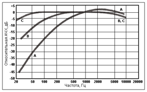 Коррекция "А" строится по отношению к чувствительности уха на 1000 Гц, принятой за базовую (нулевую), на низких частотах корректирующий коэффициент большой (из-за низкой чувствительности уха), а на частотах выше 1000 Гц коррекции практически нет (из-за практически постоянной чувствительности уха).