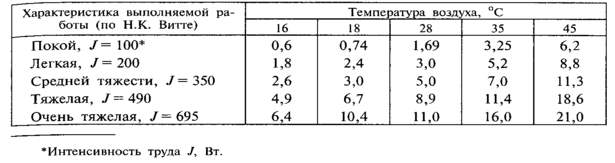 ИСПАРЕНИИ ВЛАГИ qп, выводимой на поверхность потовыми железа-ми , зависит от температуры окружающего воздуха, атмосферного давления, интенсивности труда (физической нагрузки), от скорости движения окружающего воздуха и его относительной влажности.