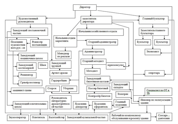 2 Схему подчиненности (цехи) и взаимодействия основных подразделений и производственных цехов театра (ТЗП-театрально-зрелищное предприятие)