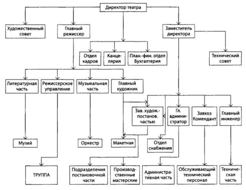 Художественно-постановочная часть. Состоит из цехов. Есть группа цехов, которая занимается производством спектакля, а есть та, которая занимается эксплуатацией уже созданных постановок. Глава – заведующий. Имеет двойственность подчинения: и худрук, и директор театра.