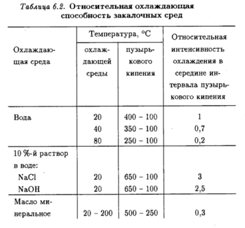 У сталей с содержанием углерода ниже 0,3% очень высокая критическая скорость Vкр (около 1200℃/с), поэтому при любом охлаждении сердцевины мы получим в ней структуру Ф+П. Но на поверхности мы имеем заэвтектоидную сталь, поэтому охлаждение требует образования структуры М. Как известно, большинство легированных сталей имеет Vкр около 120℃/с. Vохл в воде до пузырькового кипения около 200℃/с, но из-за обезуглероживающей реакции с водой и водородом, лучше использовать масло
