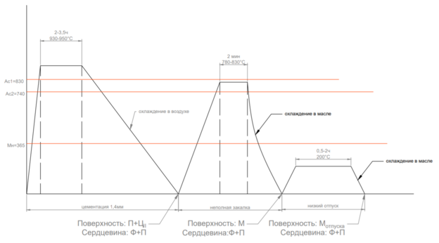 Схема термической обработки стали 20ХГНР для серийного производства тяжело нагруженных быстроходных червяков станочного суппорта с размерами по условию задания и с характеристиками: